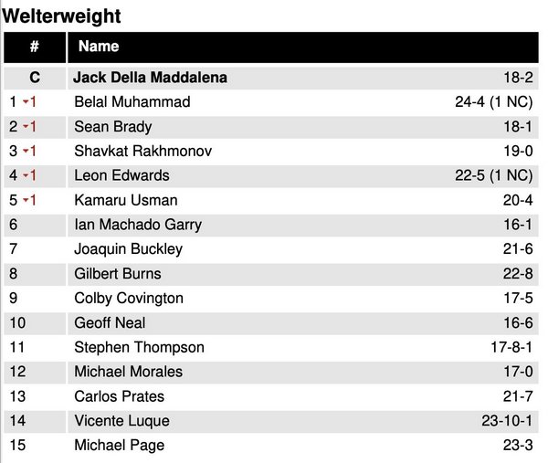 Теперь Рахмонов занимает третье место вместо второго. Это связано с изменениями после турнира UFC 315 в Монреале, где Джек Делла Маддалена победил Белала Мухаммада и завоевал чемпионский пояс. Мухаммад стал первым номером рейтинга, а вторую позицию занял Шон Брэди.