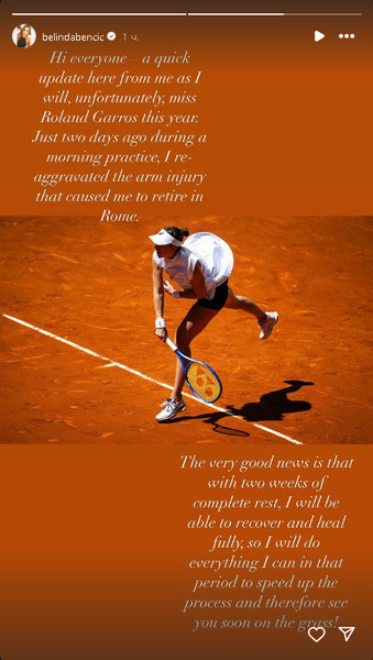 Хорошая новость в том, что двух недель полного отдыха должно быть достаточно для полного восстановления. Я сделаю всё возможное, чтобы вернуться как можно скорее и надеюсь увидеться с вами на травяных кортах!", — опубликовала в сторис экс-четвертая ракетка мира.